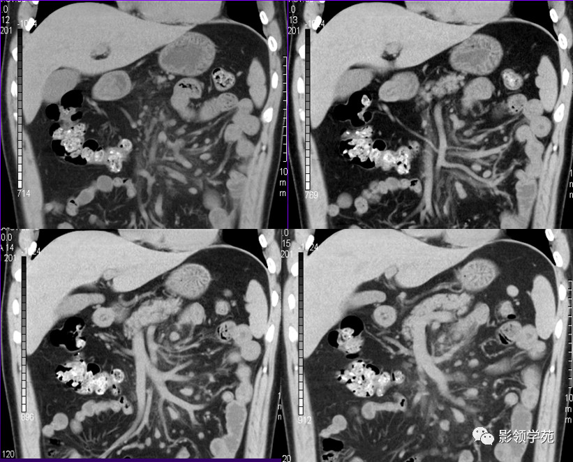 肠系膜根部软组织肿块及纤维条缩影,肠管变形及变细。