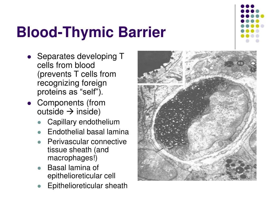 图9 血-胸腺屏障(blood-thymus barrier)是血液与胸腺皮质之间的屏障结构,由下列结构组成:连续毛细血管,其内皮细胞间有完整的紧密连接;内皮周围连续的基膜;血管周隙,内含巨噬细胞;上皮基膜;一层连续的胸腺上皮细胞。这种屏障可阻止血液内的大分子物质如抗体、细胞色素C、铁蛋白、辣根过氧化物酶等进入胸腺皮质,血液内一般抗原物质和药物不易透过此屏障;这对维持胸腺内环境的稳定,保证胸腺细胞的正常发育起到重要的作用。