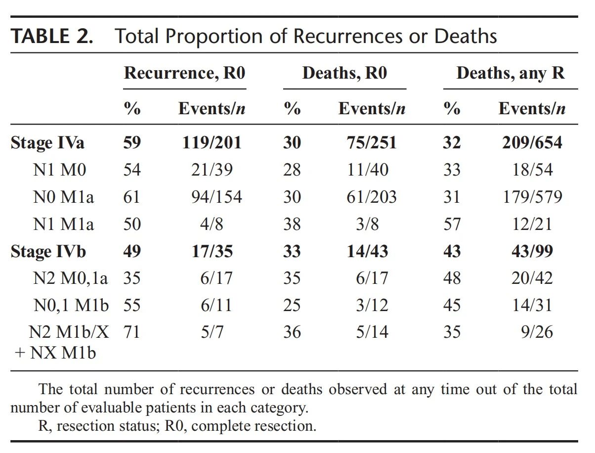 图2 根据这些数据研究者基于肿瘤大小,淋巴结和转移成立了新的分期系统。该分期系统表明T分期具有重大意义,因为淋巴结及远处转移较为少见,根据肿瘤的浸润深度分为纵隔脂肪(T1a),纵隔胸膜(T1b),心包(T2)和其他邻近器官(T3,T4)。需要重点提的是,T分期的描述是基于显微镜下表现和病理评估其侵犯情况,而不是''宏观侵犯’’。目前,纵隔胸膜和心包予以单独描述,这有助于将来更为彻底的评估其预后意义。邻近器官的侵犯基本上可分为“可切除”(T3)和“不可切除”(T4)两类。尽管病例数较多,可用于淋巴结及远处转移统计的例数仍然不多,未发现统计学显著差异。因此,建议将来采集N和M数据时更加系统化。目前, N的描述主要是基于淋巴结的分布(N1 胸腺前/周围,N2 胸内/颈部),并提供解剖学边界。M的描述区分胸膜和心包结节(M1a)和远处转移包括肺内转移(M1b)。随着定义的明确,将来有助于进一步分析。